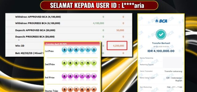 Setiap hari, member UANG4D berhasil meraih jackpot besar dari berbagai provider togel ternama yang kami sediakan, seperti Sydney, Singapore, Hongkong dan masih banyak lagi. Kami secara rutin menampilkan bukti screenshot atau rekapan kemenangan yang berhasil diraih, mulai dari kemenangan ratusan ribu hingga puluhan juta rupiah. Semua slip kemenangan ini kami hadirkan untuk membuktikan bahwa di UANG4D, peluang menang itu nyata.